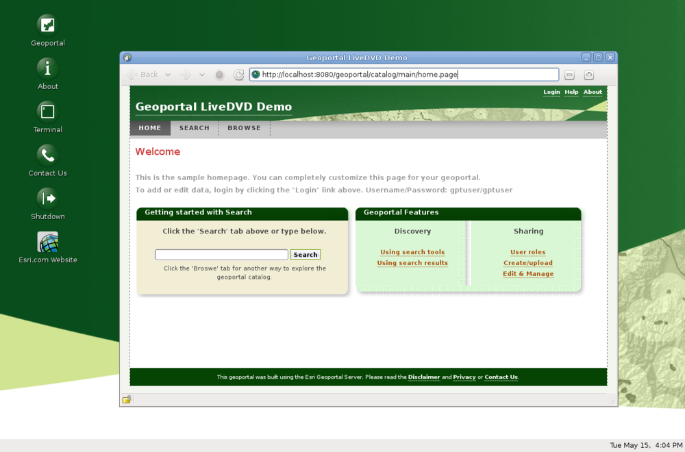 The Esri Geoportal Server LiveDVD Demo was released on Monday, May 14th. The demo provides a self-contained Linux operating system with a fully operational geoportal. You can evaluate your own personal geoportal without having to worry about installing or configuring one on a test machine. It works both as a bootable LiveDVD or a virtual machine (VM).